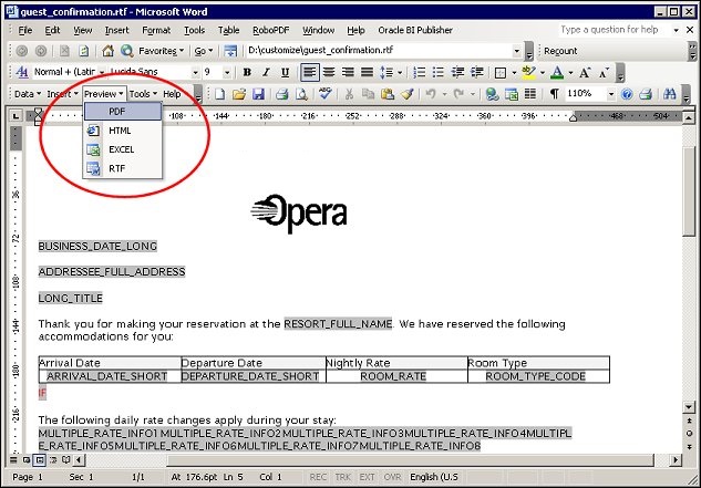 The Stationery Editor utilizes the technology of Oracle BI Publisher. The Reports stored data and the report display are separated (as opposed to using Oracle Report Builder). Microsoft Word will be used to customize layouts in RTF format, which will be converted into XSL-FO and then merged with XML data to generate final documents in PDF, HTML, or RTF format within OPERA.