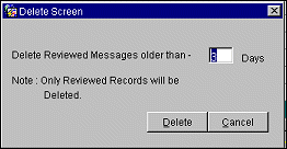 Entries that have been reviewed and check-marked can then be deleted from the System Error Log. The number of days before a reviewed entry can be deleted is defined in the Delete Screen, example shown below. Select the Delete button and only entries flagged in the ‘Review’ column will be purged. Entries of the same business day cannot be deleted. Entries that are not flagged in the Review column will not be deleted at this time. We recommend that the System Error Log be reviewed once a week and that entries are deleted after review.