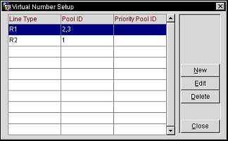 Virtual Number Setup. Select this check box to indicate that a virtual number can be set up for the line type. The virtual number consists of virtual pools that are assigned to a specific line type. If selected, a appears to the right of the field, allowing you to create, edit, or delete virtual numbers for a specific line type. The Virtual Number Setup screen appears.
