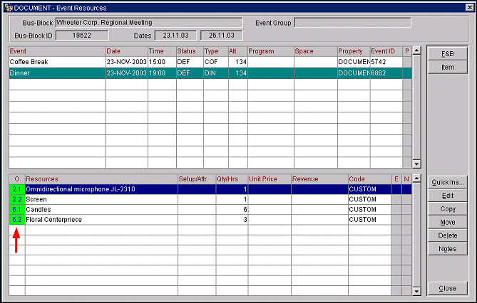 For example, suppose the following item order is specified for an event on the Event Resources screen (Business Management>Events)