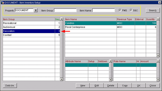 Now assume you change the sequence number of the Decoration item group (which includes the Candles and Floral Centerpiece items) from 6 to 3 on the Item Inventory Setup screen (System Configuration>Catering>Item Inventory Setup).